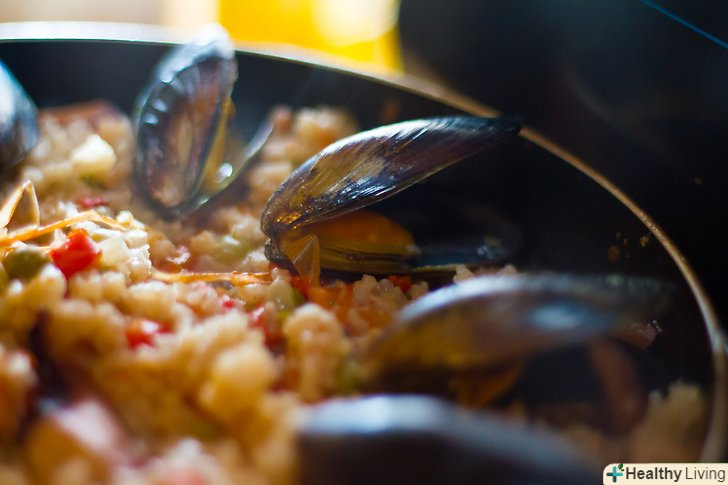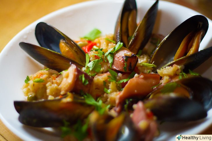 Викладіть в сковороду мідії.покладіть їх по краю. Деякі кухарі викладають мідіями на паельї цілі малюнки; але ви можете їх викласти просто рівномірно.