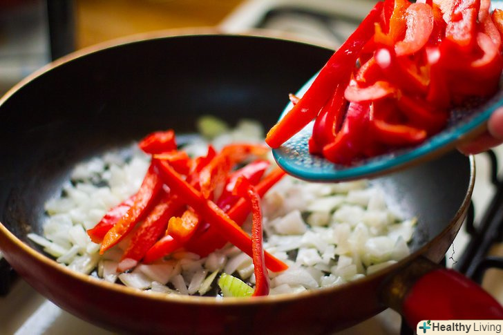 Обсмажте цибулю і перець.додайте дрібно нарізану цибулю в першу чергу і готуйте, поки він не стане прозорим.[1] потім додайте болгарський перець і обсмажуйте, поки він не стане яскравим і трохи м'яким.
