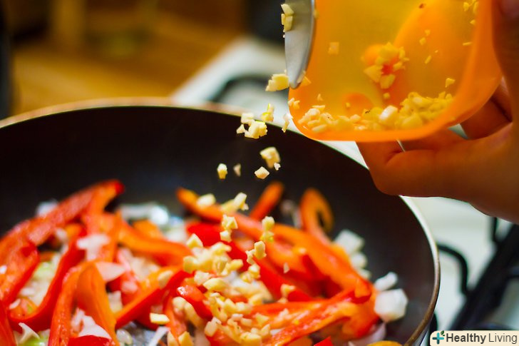 Додайте часник.спочатку зменшіть вогонь, щоб часник не підгорів, потім насипте його на цибулю і перець. Готуйте суміш ще 2 хвилини.