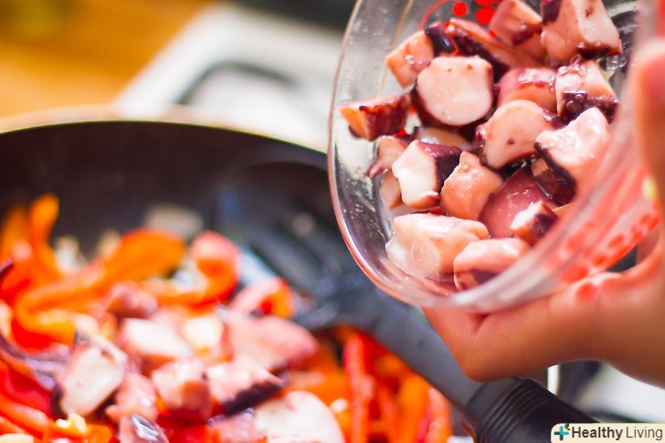 Додайте кальмара.обсмажуйте шматочки з одного боку протягом трьох хвилин, потім переверніть їх і обсмажте з іншого боку. Готуйте їх так довго, щоб основа просочилася ароматом кальмара, але сам він не повністю приготувався.- Помішуйте шматочки кальмара, щоб він не прилип до сковороди.
