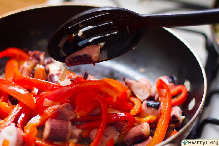 - Помішуйте шматочки кальмара, щоб він не прилип до сковороди.