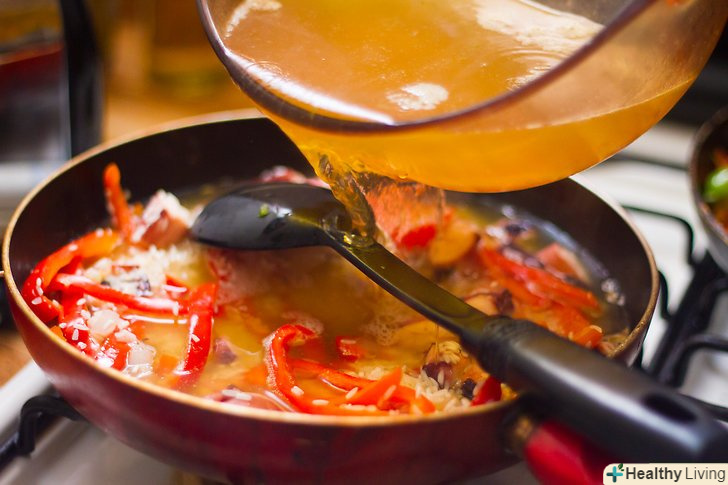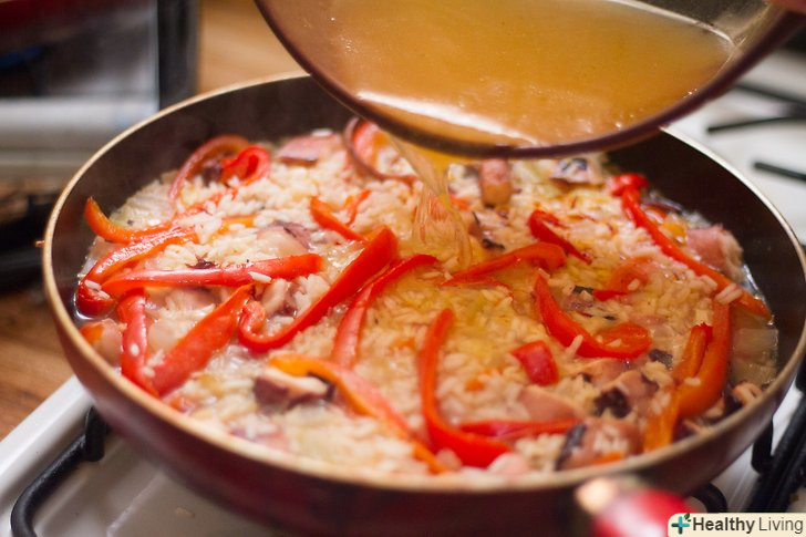Налийте бульйон і додайте спеції.додайте 2-3 склянки бульйону, червоний перець, сіль і чорний перець. Перемішайте дерев'яною ложкою. Збільште вогонь, щоб довести суміш до кипіння, а потім зменшіть і готуйте паелью на повільному вогні.- Не перемішуйте паелью після додавання бульйону.