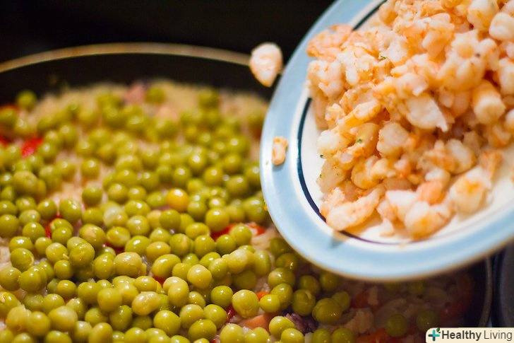 Додайте омара і горошок.викладіть омара і горошок на паелью рівномірно.[2]