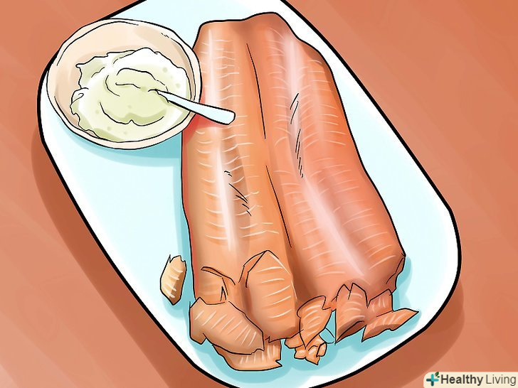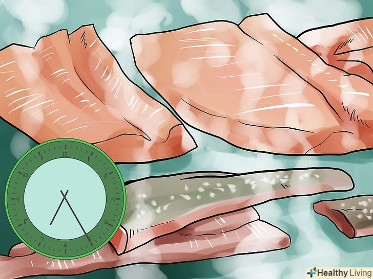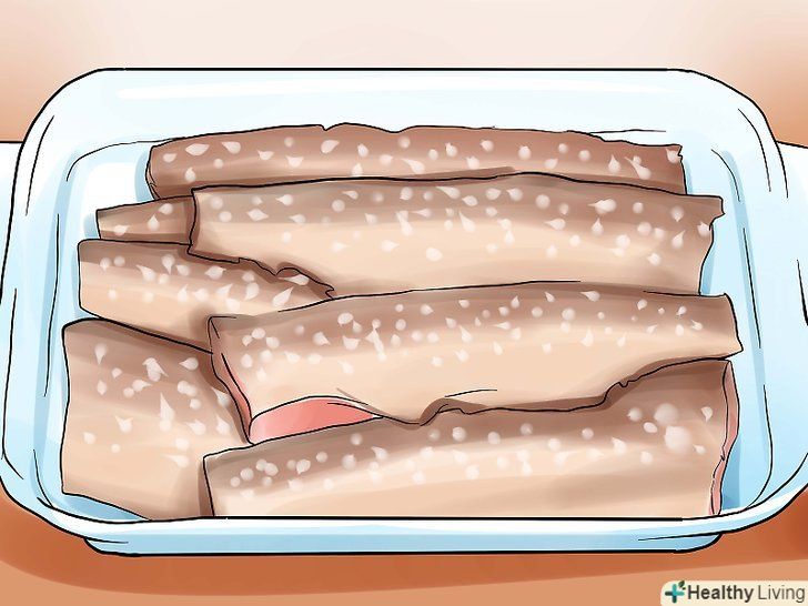Посоліть рибу сухим способом або в розсолі.Візьміть кухонну сіль і додайте в неї спеції або купіть готову сіль зі спеціями. Рясно посипте сіллю відкриту частину тушки.- Щоб приготувати розсіл для риби (тузлук), візьміть невелику миску і змішайте в ній воду, сіль, коричневий цукор і інші спеції і приправи. Покладіть рибу в тузлук і залиште на одну годину, після чого дістаньте і обсушити паперовим рушником.
