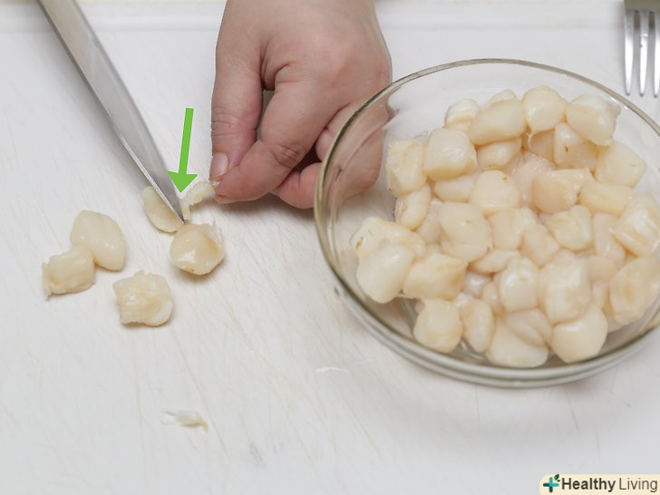 Видаліть бічні м'язи.деякі постачальники видаляють невеликі плоскі м'язи, якими Гребінці прикріплюються до своєї раковини, інші не роблять цього. Перевірте, чи немає на гребінцях цих бічних плоских м'язів, так як вони можуть бути досить жорсткими. Щоб видалити бічний м'яз, просто захопіть і витягніть її.[3]- Бічні м'язи можна викинути або зберегти для рибних страв. Нічого страшного, якщо ви пропустите пару м'язів - вони їстівні.