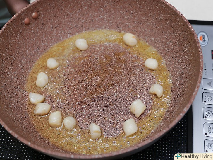 Викладіть гребінців на сковороду.викладайте їх від краю всередину по колу. Вони повинні розміститися досить вільно. Не переміщайте їх після того, як викладіть на сковороду.[7]- Викладайте гребінців від краю до центру сковороди. В цьому випадку Гребінці підсмажаться однорідно, оскільки в центрі вони готуються швидше.