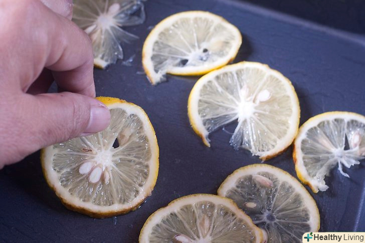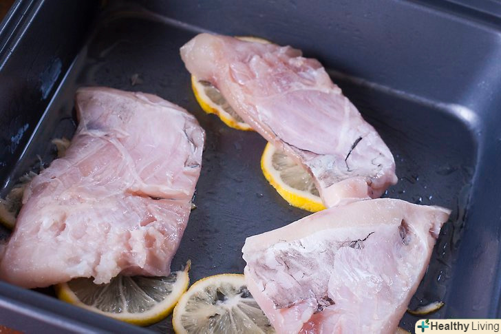 Викладіть деко з обідком скибочками лимона.Випічка філе з скибочками лимона зверху допомагає їм утримувати вологу. Спочатку злегка змастіть деко, у якого є обід. Наріжте лимон на тонкі диски і викладіть їх на деко.