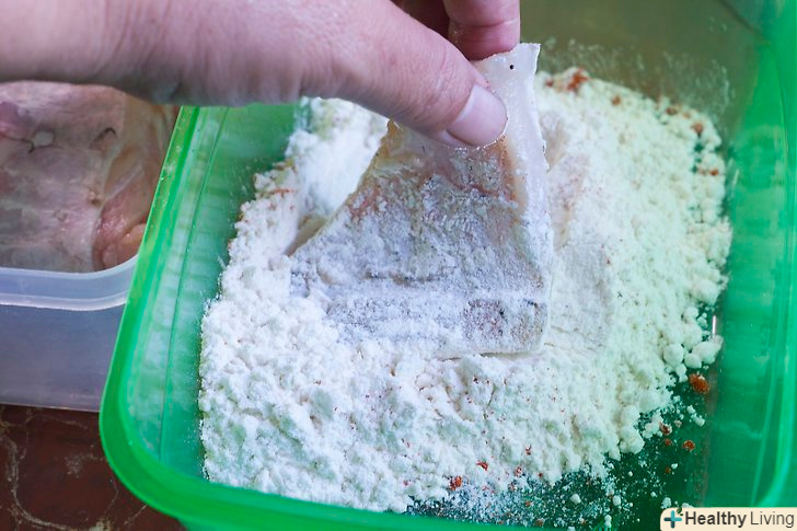 Обваляйте філе в клярі.переконайтеся, що кожен шматок добре покритий з усіх боків. Спробуйте покласти філе і тісто разом в пакет і струсіть його, щоб покрити філе рівномірно.