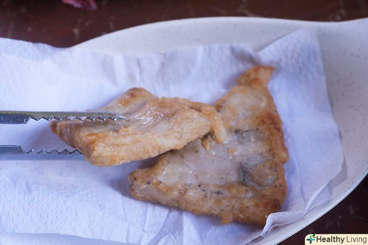 Вийміть філе і висушіть їх на паперовому рушнику.використовуйте шумовку, щоб перекласти філе з каструлі на тарілки застелені рушником. Смажені шматочки риби чудові, коли подаються з часточками лимона і соусом тартар.