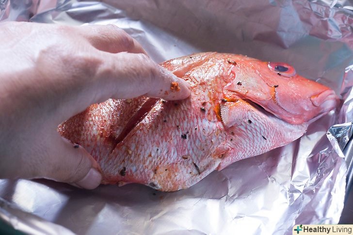 Приправте рибу.червоний люціан чудовий з легкими приправами, які доповнюють його свіжий смак. Посипте сіллю, перцем і лимонним соком за смаком всередині порожнини риби. Додайте шматочки вершкового масла всередину риби, щоб тримати її вологою, поки вона запікається. Приправте зовні додатковою сіллю і перцем.- Якщо ви хочете, щоб у страви був трав'яний смак, додайте гілочки чебрецю, розмарину або базиліка всередину порожнини риби.
