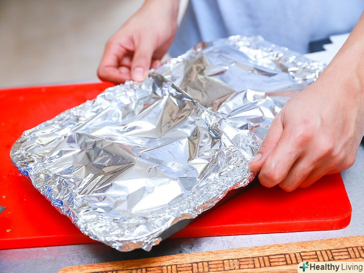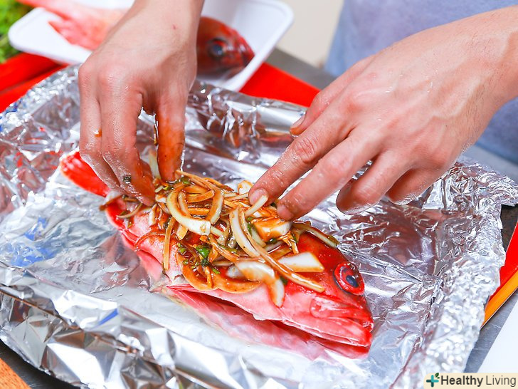 Викладіть поверхню, де будете готувати рибу, фольгою.якщо ви готуєте в духовці, викладіть деко фольгою, фольги повинно бути стільки, щоб ви змогли вільно обернути рибу. Також покладіть на решітку гриля стільки фольги, щоб загорнути в неї рибу.- Ви можете загорнути рибу в бананове листя або в листя ті.