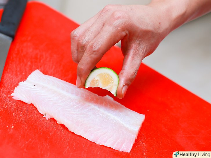 Покладіть рибу на деко або решітку гриля, викладені фольгою.розмістіть рибу в центрі листа фольги. Посипте рибу сумішшю приправ. Якщо хочете, додайте скибочки лимона або лайма.