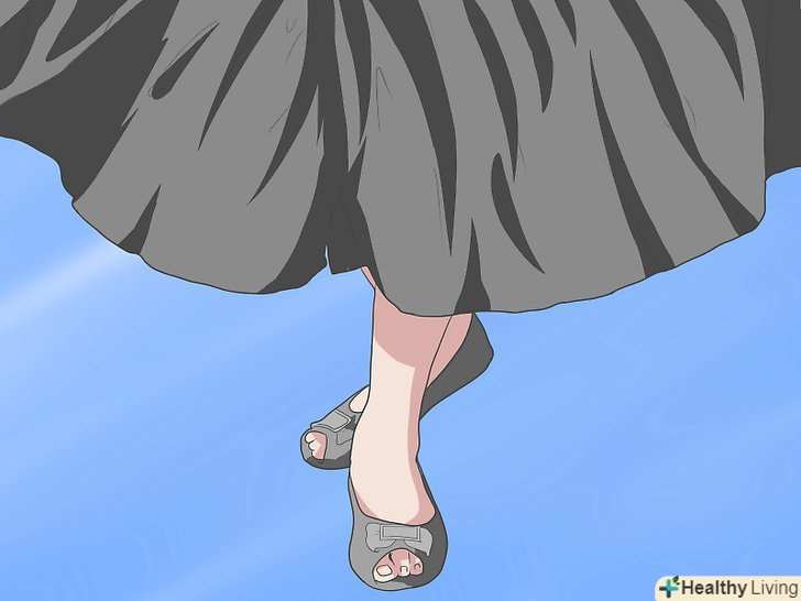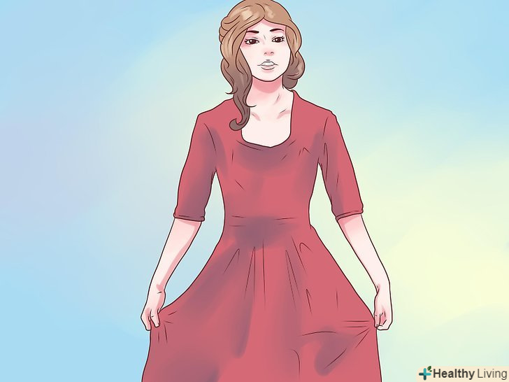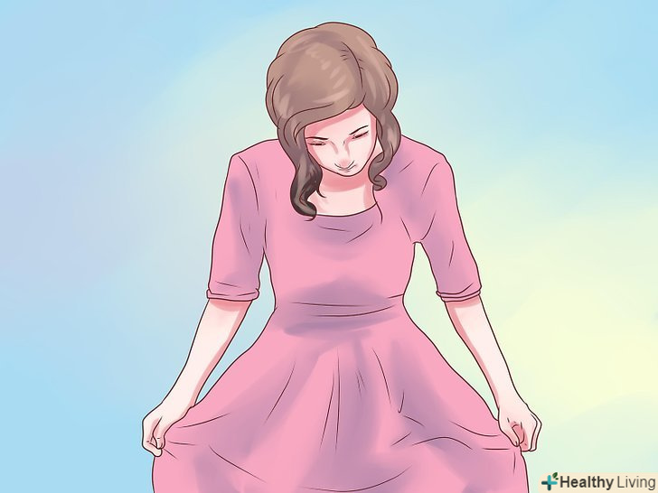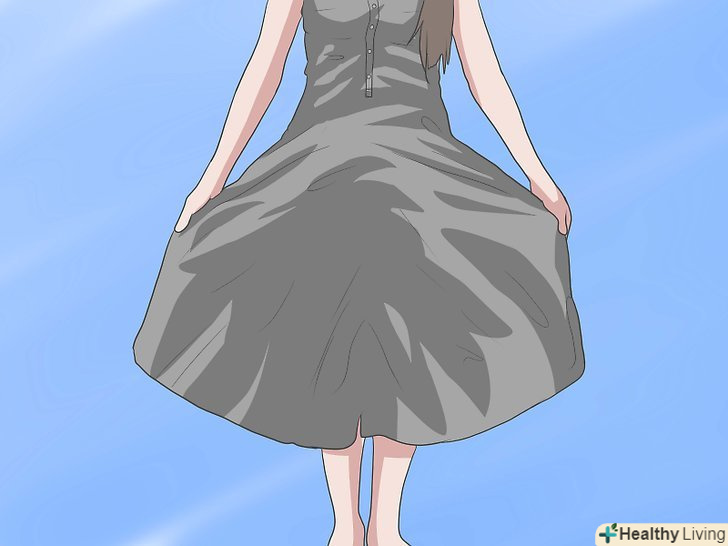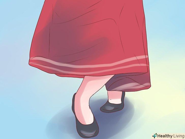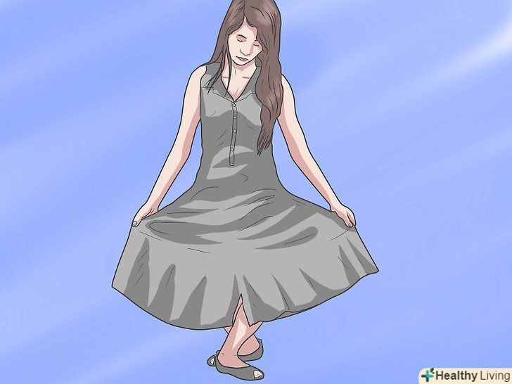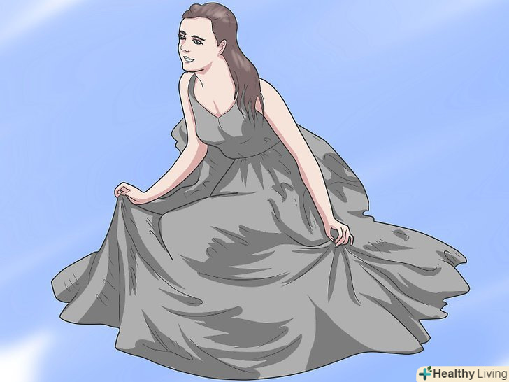 Візьміть спідницю.Візьміть краї вашої спідниці так, щоб вони були затиснуті між великим пальцем і першими двома пальцями обох рук, витягаючи мізинці. Плавно підніміть спідницю з обох сторін. Якщо спідниця вашої сукні занадто вузька, щоб її розтягнути, просто тримайте руки внизу з боків.
