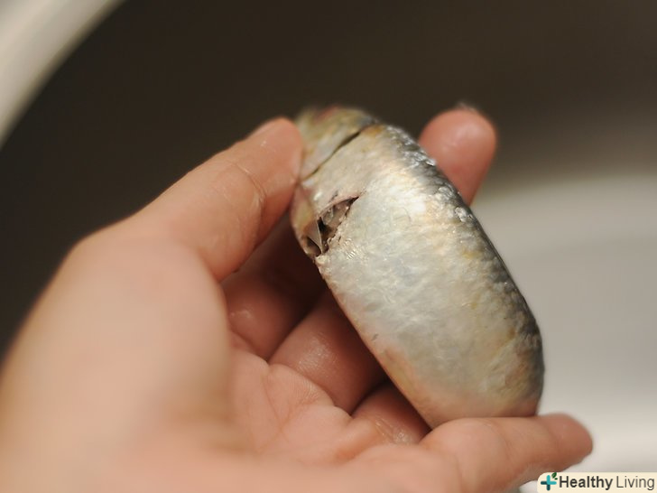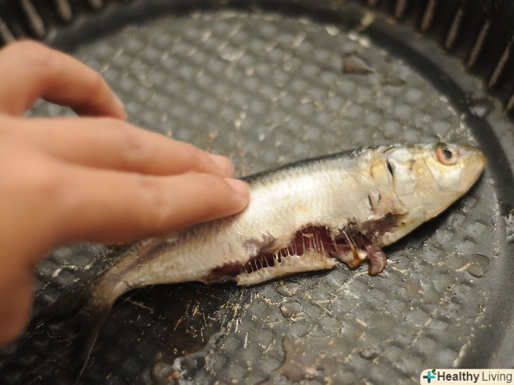 Распоріте черевце 1 сардини за раз, утримуючи рибу в одній руці животом вгору.для підготовки сардини, розріжте живіт риби по всій довжині гострим філейним ножем. Видаліть нутрощі і викиньте їх.