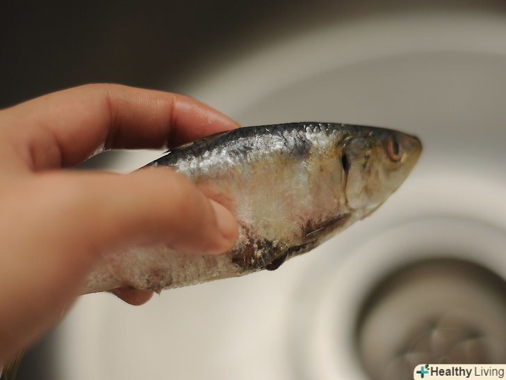 Очистіть сардини, тримаючи їх під холодною проточною водою.при підготовці сардин, вам потрібно видалити всю грубу луску. Потріть пальцями назад і вперед з боків, обтрушуючи залишилася луску.