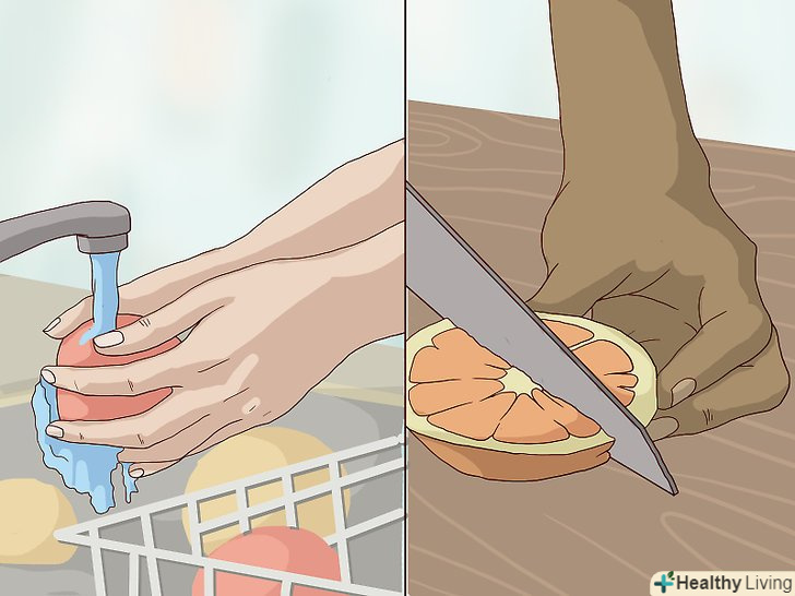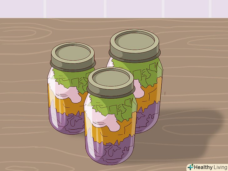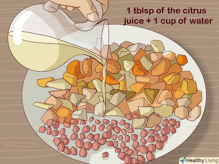 Щоб фрукти не окислилися, додайте в них цитрусовий сік.розріжте лимон, лайм, апельсин або ананас і видавіть сік в окрему чашку. Розведіть одну столову ложку (15 мілілітрів) соку в склянці (250 мілілітрів) води, полийте нею фрукти і перемішайте їх.[6]- Цитрусовий сік необхідний лише для окислюються фруктів. Якщо ви приготували салат з таких фруктів, які не окислюються (до них відносяться ягоди, диня і цитрусові), просто покладіть його в харчовий контейнер, накрийте кришкою і поставте в холодильник.
