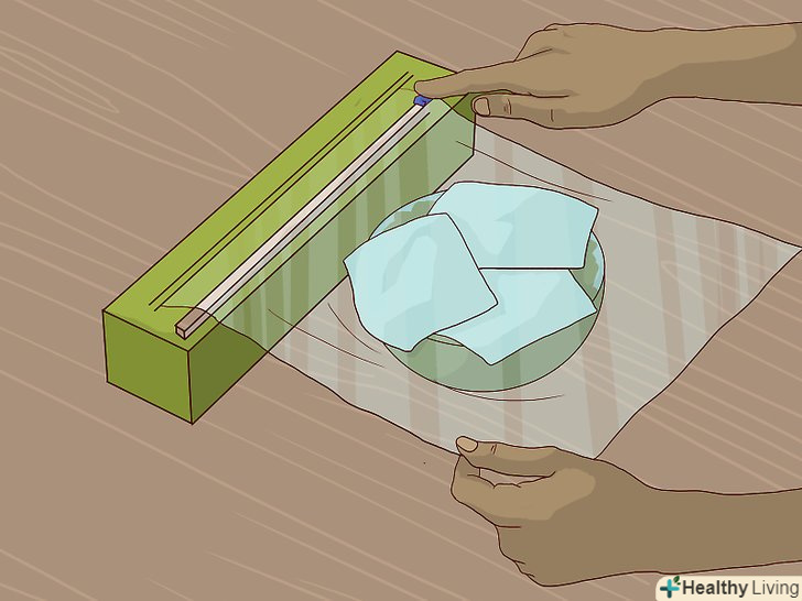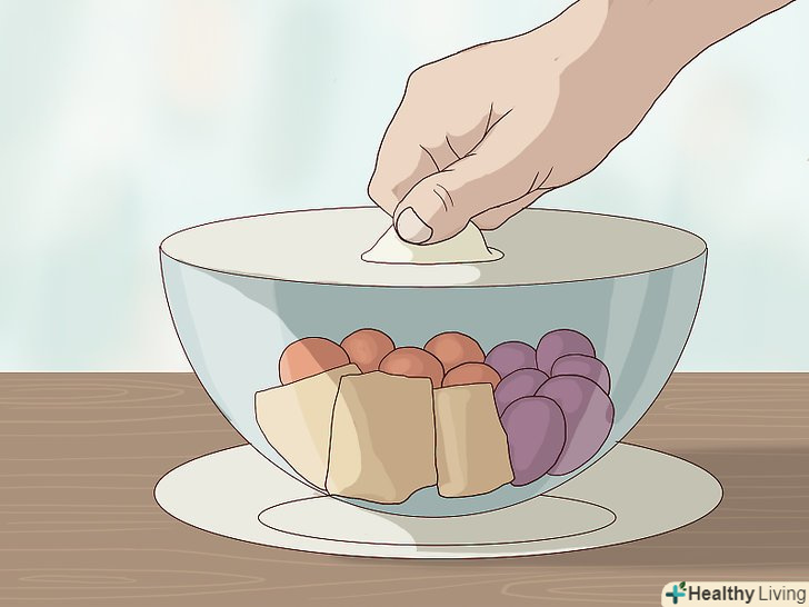 Накрийте миску щільно прилягаючою кришкою.фрукти містять більше води і тому псуються швидше, ніж листові овочі, так що постарайтеся зберігати фруктовий салат в щільно закривається ємності. Якщо у вас немає відповідної кришки, накрийте миску харчовою плівкою.