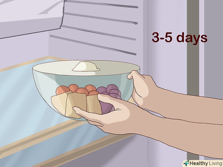 Зберігайте фруктовий салат в холодильнику протягом 3-5 днів.щоб салат якомога довше залишався свіжим, його слід зберігати в холодильнику, навіть якщо він не містить окислюються фруктів. З'їжте салат протягом п'яти днів, інакше фрукти втратять свіжість.[8]