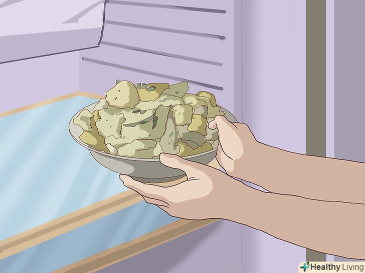 Постарайтеся якомога швидше поставити салат в холодильник.салати з готовими інгредієнтами необхідно тримати в холодильнику, інакше вони можуть швидко зіпсуватися.- Викиньте салат, якщо він простояв в теплі довше двох годин або став неприємно пахнути — це особливо стосується заправлених майонезом салатів з яйцями або картоплею.[10]
