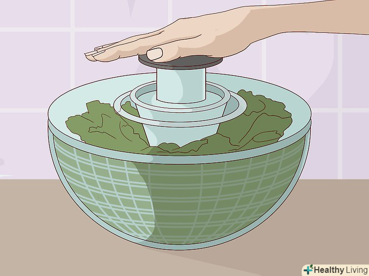 Висушіть листя за допомогою центрифуги для обсушування салатного листя.покладіть листя салату в друшляк центрифуги і щільно накрийте кришкою. Запустіть центрифугу на 15-20 секунд, щоб видалити зайву воду.[2]