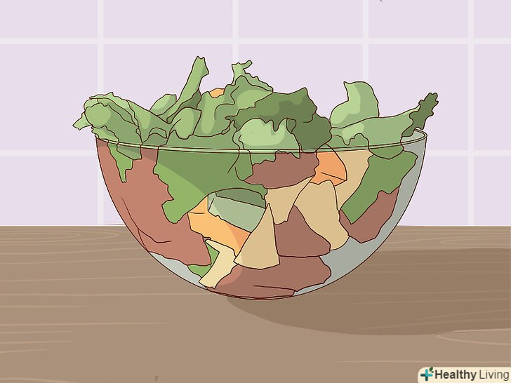 Якщо салат містить водянисті овочі, накрийте його кількома паперовими рушниками.якщо в салаті є овочі з високим вмістом води, наприклад помідори і огірки, слід вжити додаткових заходів, щоб листя не розмокли завчасно. Насипте в миску частину салату і накрийте його паперовим рушником. Потім викладіть на паперовий рушник ще трохи салату і накрийте другим паперовим рушником. Зробіть 2-4 таких шару і прикрийте миску ще одним паперовим рушником.- Велика кількість води міститься також в таких овочах, як селера, редиска, кабачки, гарбуз і солодкий перець.[5]