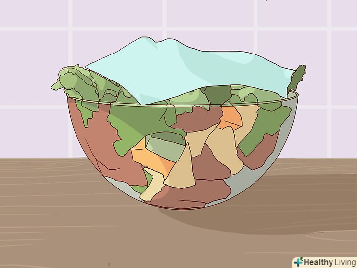 Накрийте миску з салатом чистим і сухим паперовим рушником.покладіть рушник поверх листя або загорніть в нього миску, якщо вона досить дрібна. Рушник вбере вологу, і листя не розмокнуть.[4]