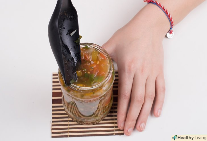 Розлийте сальсу по чистим банкам для консервування.наповніть банки, не доливаючи 0.5 см. до горлечка. Використовуйте воронку, щоб герметична прокладка між банкою і кришкою залишалася чистою.- Перед початком консервування можна помити скляні банки для консервування, використовуючи цикл гарячої води в посудомийній машині. Для дезінфекції, покладіть кришки в киплячу воду на пару хвилин.