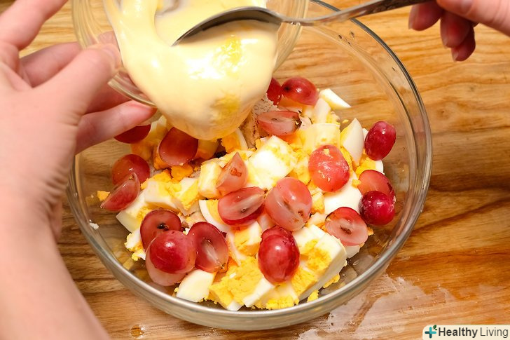 З'єднайте курку, яйця, виноград (або родзинки) і заправку.накрийте пластиковою плівкою і помістіть в холодильник хоча б на 30 хвилин, краще, на годину.
