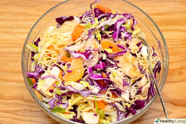 У салатниці змішайте пекінську капусту, червону капусту, моркву, цибулю-шалот, мандарин, локшину і нарізану курку.