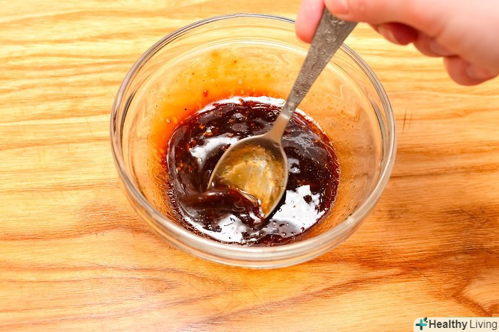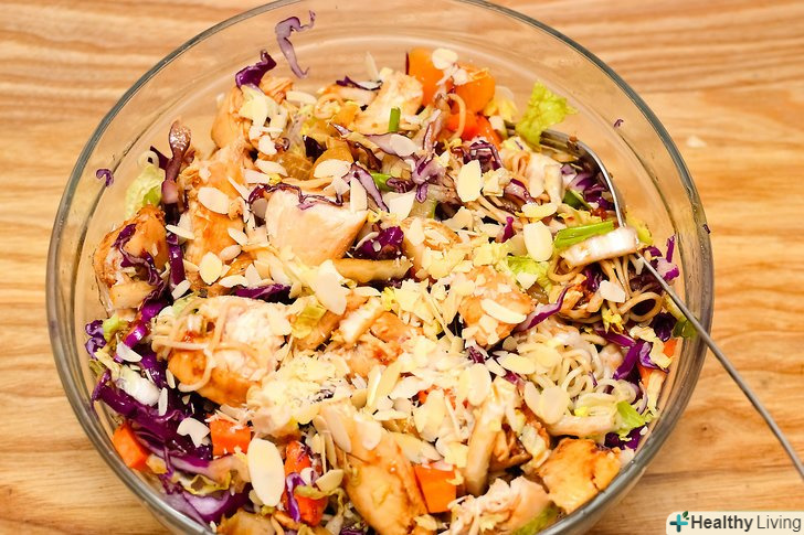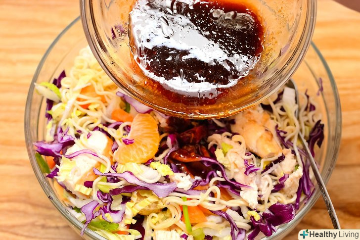 Збийте разом інгредієнти салатної заправки в окремій мисці.збийте разом 3 столові ложки соєвого соусу, оцту, часнику, імбиру, масла, 1 ½ чайної ложки кунжутного масла, коричневого цукру і соусу чилі.