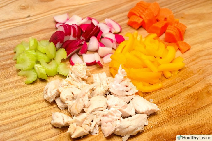 Підготуйте курку і всі овочі, які ви хочете покласти в салат, нарізавши на маленькі шматочки.
