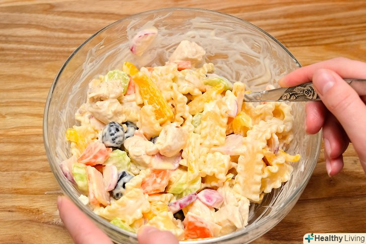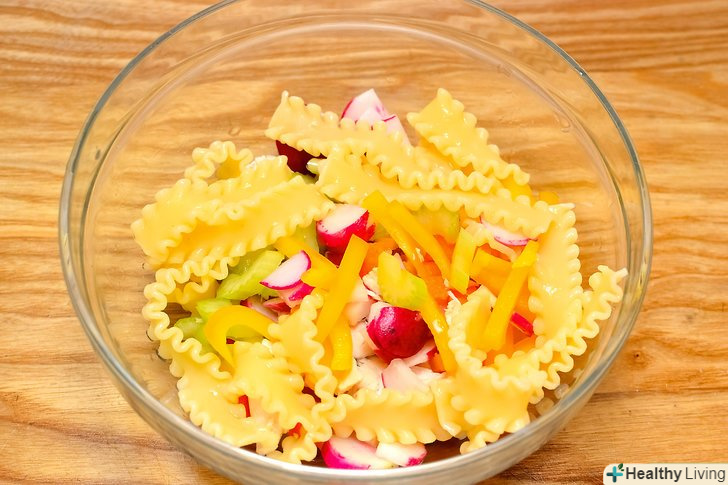 Коли локшина охолоне і буде готова, помістіть її в миску.розмір миски залежить від того, скільки інгредієнтів ви збираєтеся покласти в салат. Покладіть інші інгредієнти і майонез.