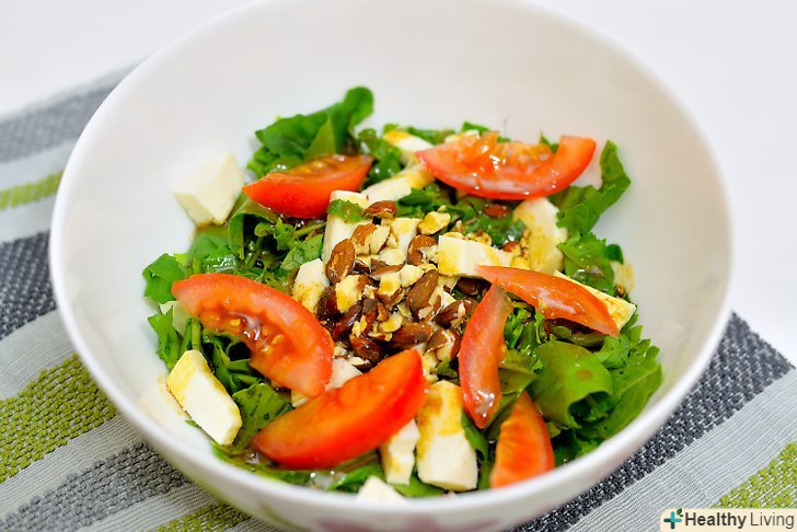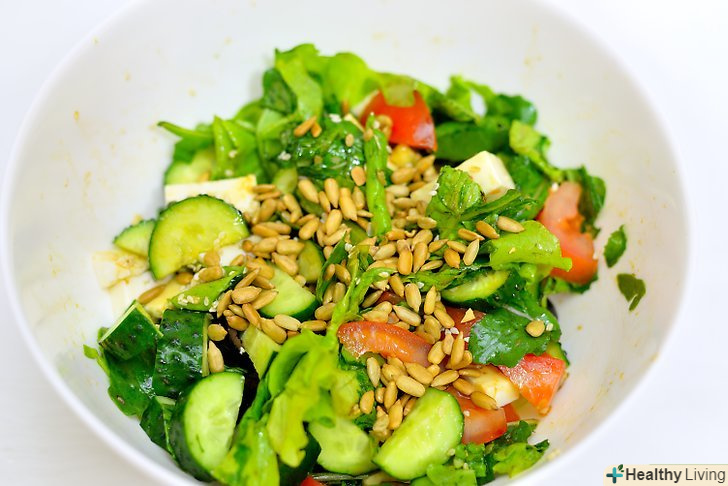 Додайте різнокольорових овочів.це не тільки для краси. Різноманітність кольорів в салаті означає різноманітність вітамінів. Шматочки червоного, оранжевого або жовтого болгарського перцю – відмінний варіант. Також можна додати терту моркву, буряк (сиру, мариновану або варену) або шматочки томатів.- Також можна додати їстівні квіти.