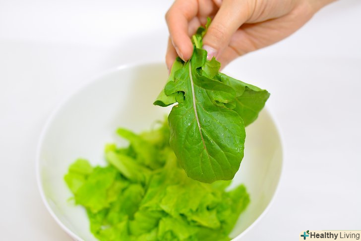 Наріжте зелень.якщо ви не впевнені, як саме слід нарізати зелень, наріжте невелику кількість і спробуйте, щоб оцінити текстуру. Хрусткі салати можна просто нарвати, а можна нарізати на невеликі шматочки уздовж стебла. У зелені з волокнистим стеблом, наприклад, у капусти кале, необхідно прибрати стебла, а потім нарізати листя на тонкі шматочки.- Кале також рекомендується трохи пом'яти, щоб зламати тверді волокна. Покладіть її в миску, приправте оцтом або лимонним соком, а потім руками придушіть листя. Закінчивши, дайте салату "відпочити" перед подачею на стіл 5-15 хвилин.[1]