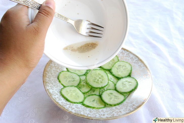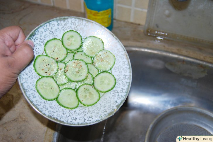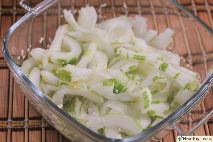 Посипте огірки невеликою кількістю солі.покладіть тонко нарізані огірки в друшляк і посипте їх ½ чайної ложки (3-4 грами) солі. Злегка перемішайте огірки, щоб рівномірно розподілити сіль.