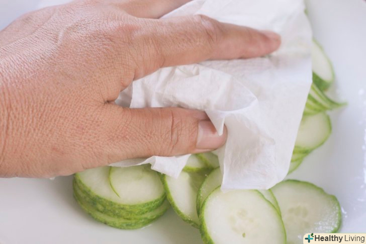 Затисніть скибочки огірків між паперовими рушниками, щоб папір ввібрала зайву вологу.постеліть на стіл паперовий рушник, рівним шаром викладіть на нього скибочки огірків і накрийте їх ще одним паперовим рушником. Після цього злегка натисніть на верхній рушник, щоб воно ввібрало надлишкову вологу.