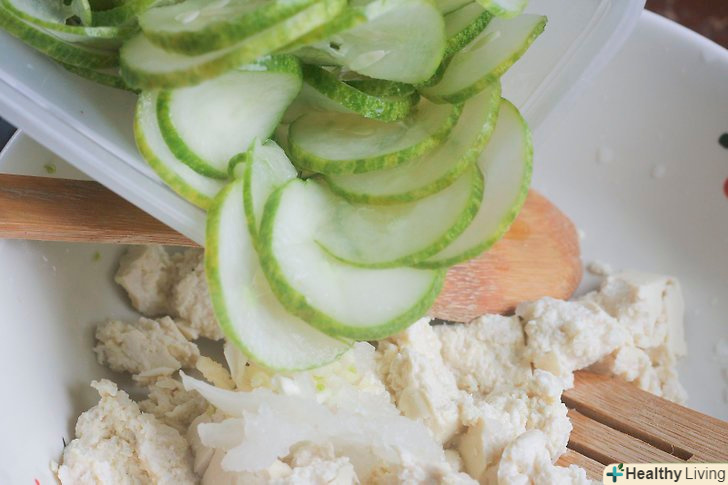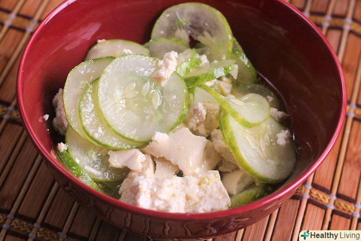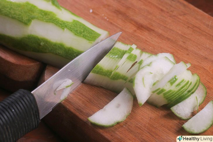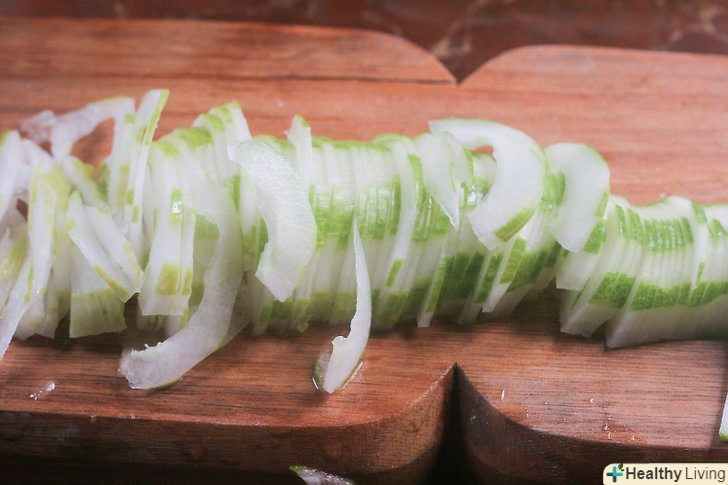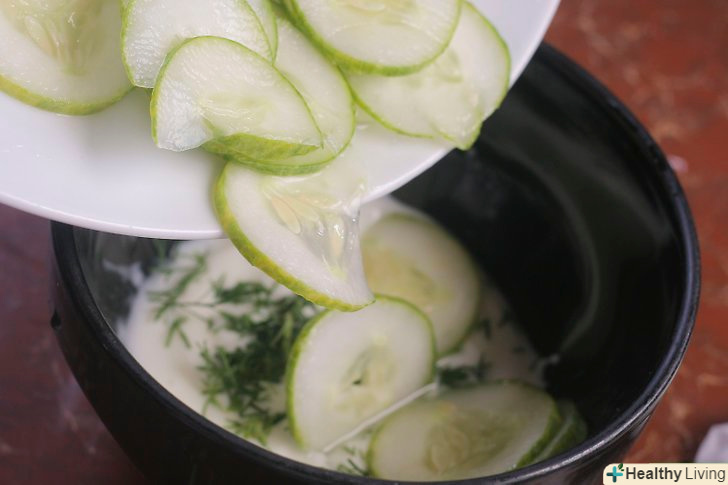 Почистіть і поріжте огірки.постарайтеся нарізати огірки якомога тонше. Якщо огірки мають великі насіння, видаліть їх. Після цього складіть порізані огірки у велику сервірувальну миску.