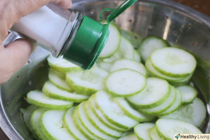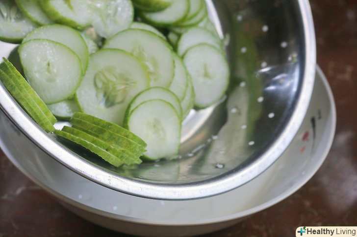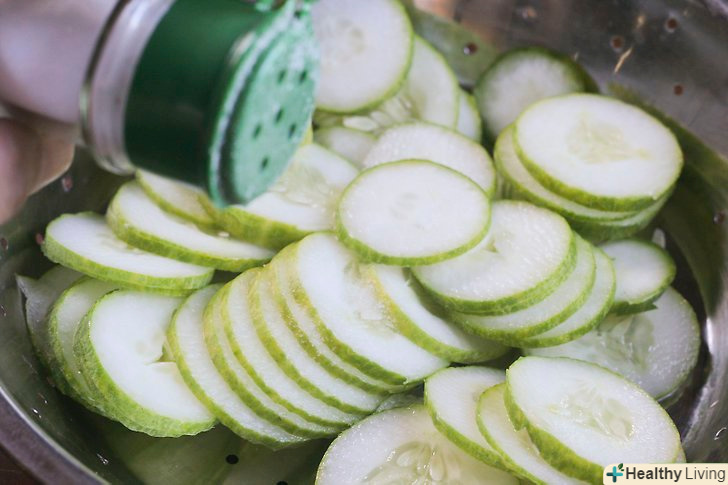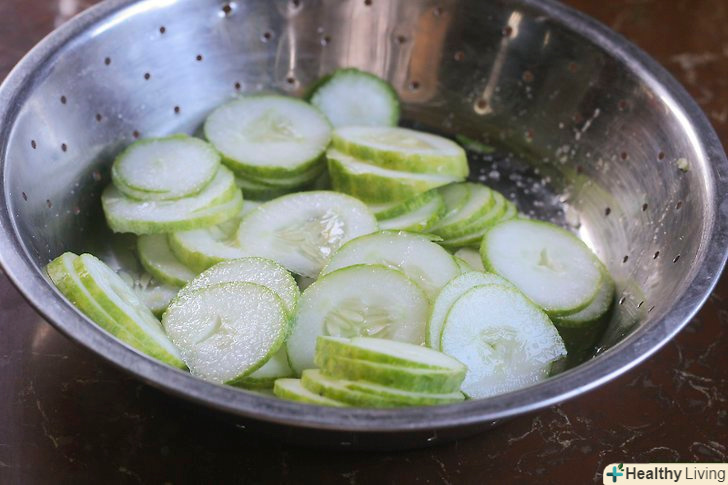 Покладіть огірки в друшляк і посипте їх сіллю.поставте друшляк або сито на миску. Перекладіть огірки в друшляк і посипте їх щедрою дрібкою солі. Злегка струсіть друшляк, щоб рівномірно розподілити сіль.- Не використовуйте для цього сервірувальну миску.