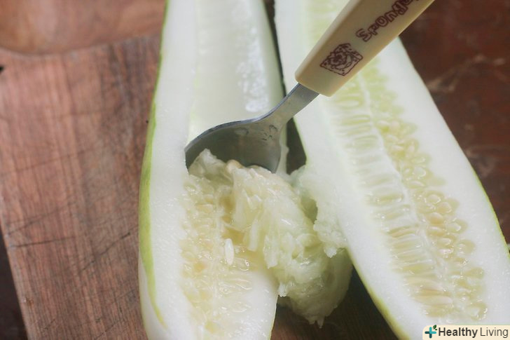 Вийміть з огірків серцевину.розріжте огірки по довжині на дві половинки. Вийміть м'якоть з насінням за допомогою ложки і викиньте її. Це слід зробити і в тому випадку, якщо у вас "безнасінний" сорт огірків.
