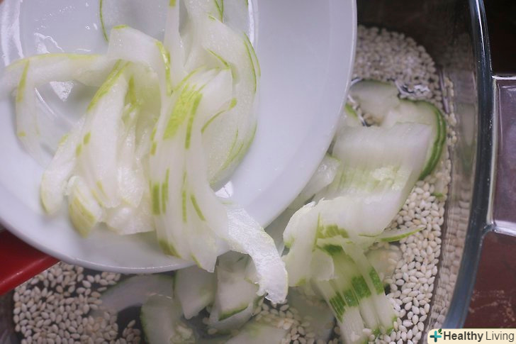 Додайте в миску огірки і насіння кунжуту.перемішайте все салатними щипцями. При цьому не забувайте захоплювати скибочки огірків з самого дна миски.