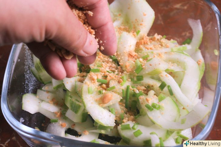 Додайте в салат арахіс і зелену цибулю.якщо у вас немає подрібненого арахісу, можна почистити цілісний арахіс і подрібнити його гострим ножем. Можна також буквально на кілька секунд помістити зерна арахісу в кухонний комбайн.