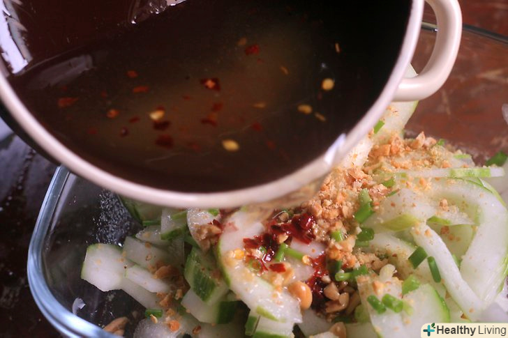 Приготуйте заправку.налийте оцет в невелику миску. Додайте цукор, кунжутне масло, подрібнений червоний перець і сіль. Перемішайте все виделкою або невеликий мутовкой і відставте миску в сторону. Поки ви будете готувати салат, заправка настоїться і стане більш ароматною.