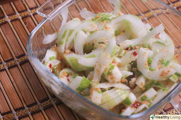 Покладіть тонко нарізані огірки в невелику миску.можна взяти як окрему миску, так і ту, в яку ви покладете салат. Необхідно буде на кілька годин поставити салат в холодильник, а потім злити зайву воду.- Постарайтеся використовувати огірки без насіння. Якщо огірки мають насіння, з них необхідно вирізати серцевину.