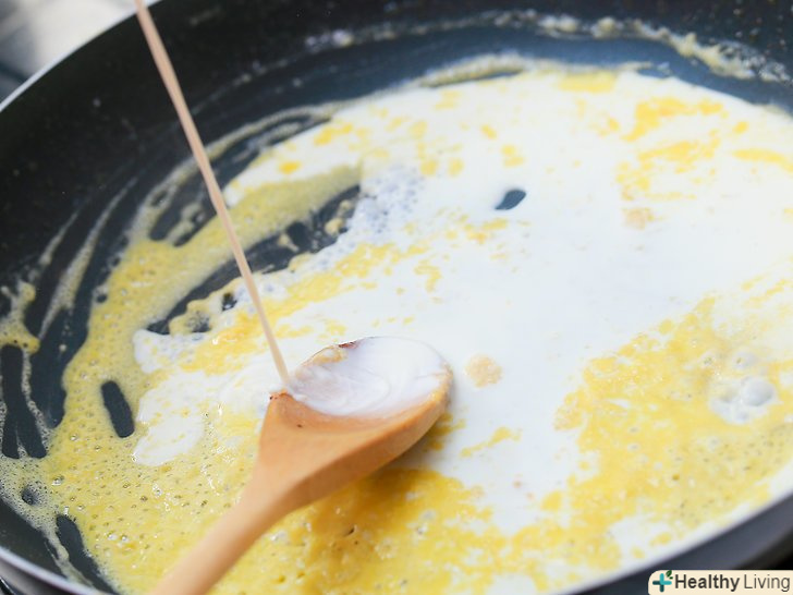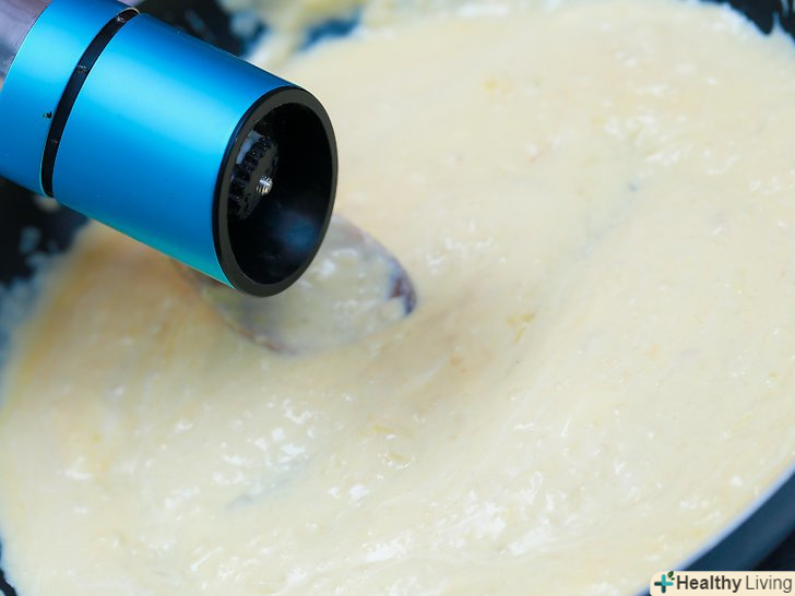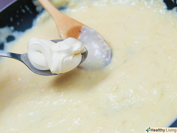 Додайте в соус 3 столові ложки (45 мл) жирних вершків по 1 столовій ложці (15 мл) за раз.після додавання кожної ложки ретельно перемішуйте.
