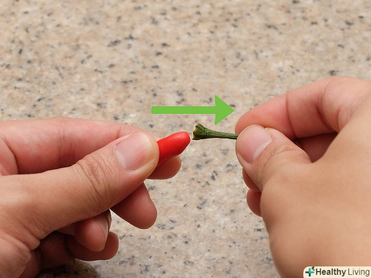 Видаліть з перців плодоніжки.ретельно мийте перець під проточною холодною водою, щоб видалити весь бруд. Щоб прибрати плодоніжки, просто зріжте верхню частину перцю гострим ножем.[3]