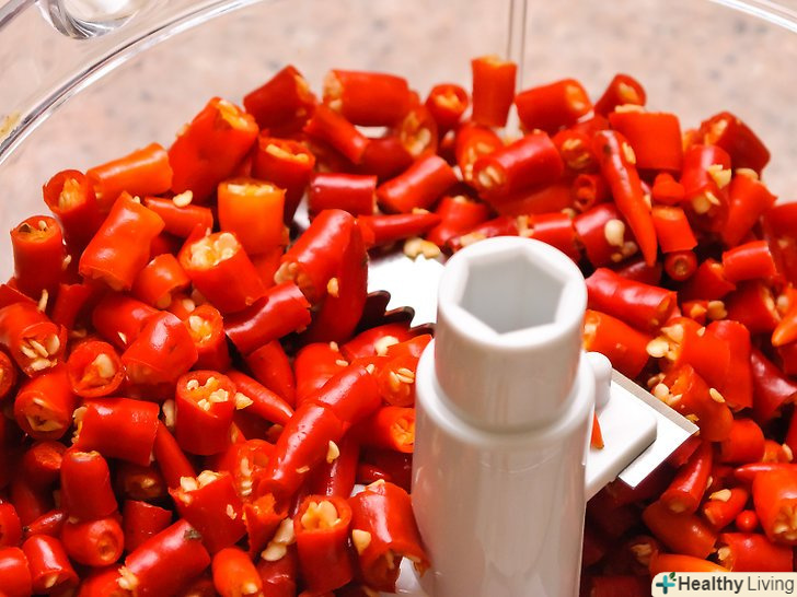 Подрібніть перці вручну або в кухонному комбайні.Покладіть всі перці разом з витягнутими плодоніжками в кухонний комбайн або блендер. Увімкніть пристрій і перемеліть до однорідного стану.[4] якщо у вас немає жодного з цих пристроїв, можна подрібнити перці і вручну.