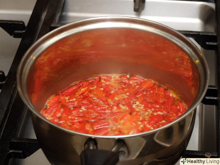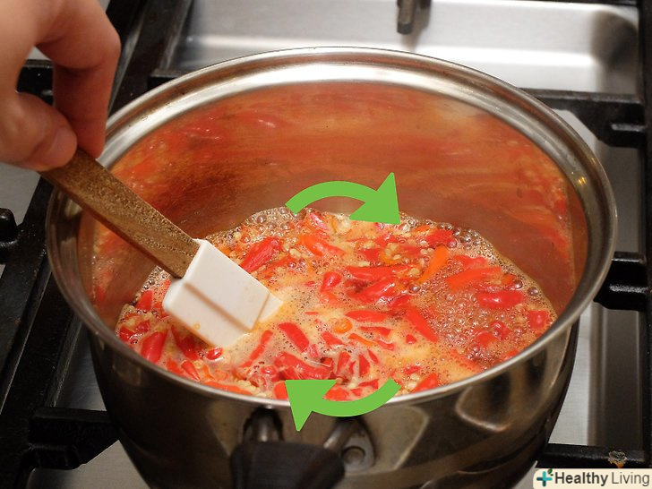 Проваріть соус 5 хвилин.як тільки соус закипить, зменшіть вогонь до мінімуму. Нехай соус покипить близько 5 хвилин. Щоб не переварити перці, встановіть таймер. Після закінчення часу відразу ж зніміть соус з плити.[7]- Час від часу помішуйте, але не варто довго стояти над каструлею і вдихати пари. Пар, який виходить від гарячого соусу, провокує роздратування верхніх і нижніх дихальних шляхів.[8]