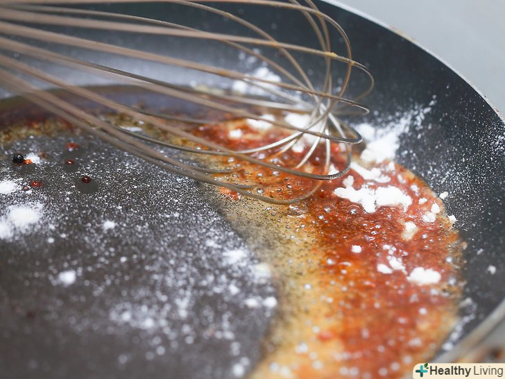Насипте 3 столові ложки білого борошна в каструлю з гарячим маслом, ретельно перемішуючи інгредієнти віночком.перемішуйте до тих пір, поки суміш не придбає гладку консистенцію. Додавайте борошно по 1 ложці за прийом, ретельно перемішуйте до гладкості, потім додавайте наступну ложку борошна. Ви помітите, як підлива почне густіти.- Чим довше ви будете готувати борошно, тим темніше і більш насиченим вийде підлива. Для отримання світлої підливи зупиніться, коли борошно стане злегка коричневою. Для отримання більш темної підливи продовжуйте готувати борошно ще 3-5 хвилин, не забуваючи постійно помішувати.