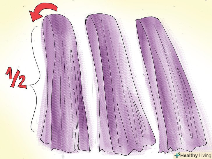 Складіть смужки навпіл.щоб прив'язати смужки на стрічку, спочатку їх потрібно скласти навпіл. Ви можете складати їх поступово під час роботи, або зробити це разом в кінці. Так у вас будуть смужки з двома вільними кінцями знизу і петлею зверху.