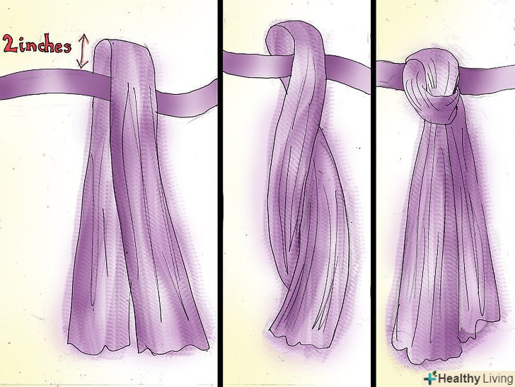 Прив'яжіть свою першу смужку. Покладіть складену навпіл смужку зверху стрічки. Поверніть її так, щоб петля обхопила стрічку, і зверху нехай залишається близько 5 см тканини. Зав'яжіть кінці смужки і затягніть вузол на стрічці. Так у вас вийде звичайний вузол.